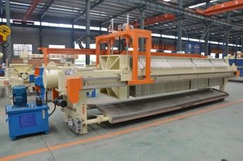 隔膜壓濾機(jī),隔膜壓榨壓濾機(jī)由隔膜板和廂式濾板排列組成濾室,在輸料泵的壓力作用下將漿料輸入濾室,通過過濾介質(zhì)(濾布)將濾料中的固體和液體分離,當(dāng)漿料中的固體形成餅后,再向隔膜通入空氣,對濾室內(nèi)的固體充分壓榨,降低含水率。對于粘性物料的過濾及對含水率要求較高的用戶,此機(jī)更有其獨(dú)特的特性。